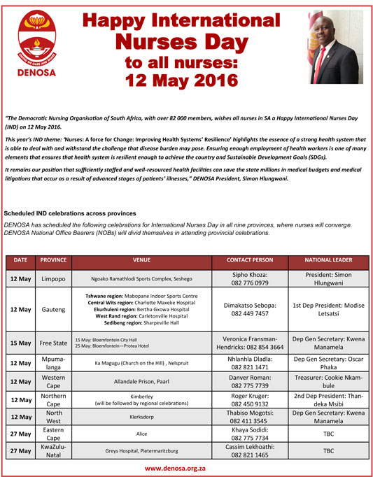 DENOSA Wishes all nurses in South Africa a Happy International Nurses Day on 12 May 2016, which will be celebrated across provinces and health institutions from tomorrow onwards. This year’s celebration is held under the theme: Nurses: A For Change: Improving health systems’ resilience.