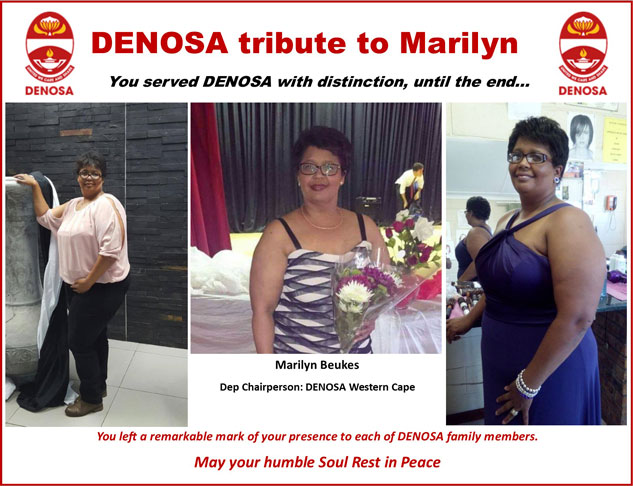 DENOSA is honoured and humbled to have had cde Marilyn Beukes as its leader in her lifetime, a cadre who spent sleepless nights on the road serving the organisation with distinction until the last minute of her life.