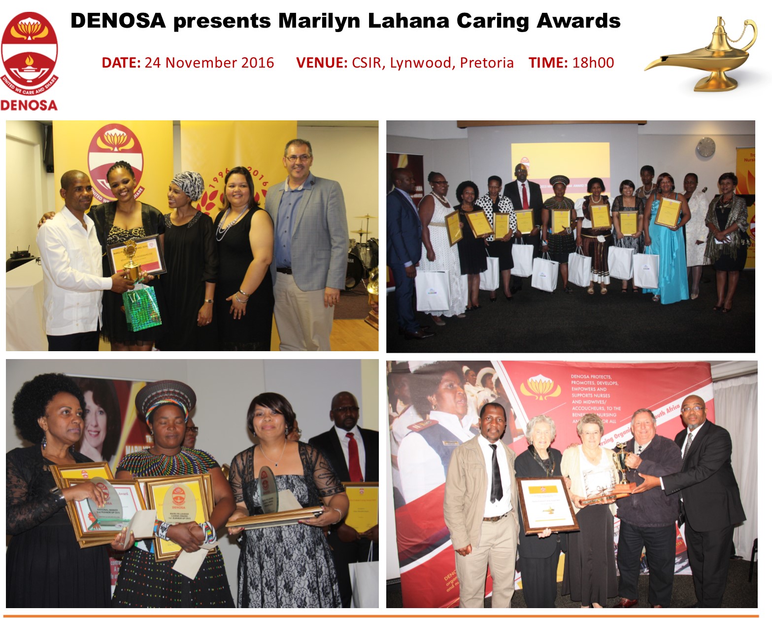 The Democratic Nursing Organisation of South Africa (DENOSA) cordially invites members of the media to its annual national Marilyn Lahana Caring Awards ceremony on Thursday 24 November 2016 at the CSIR Conference Centre, Pretoria, which will award the most dedicated and selfless nurse in SA.
