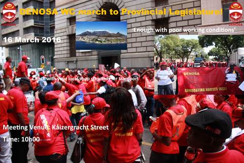 The Democratic Nursing Organisation of South Africa (DENOSA) in Western Cape will be leading a nurses’ march from various health facilities in the province to hand over a memorandum of demands for the improvement of their working conditions at the Provincial Legislature on Wednesday 16 March 2016.