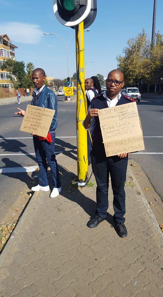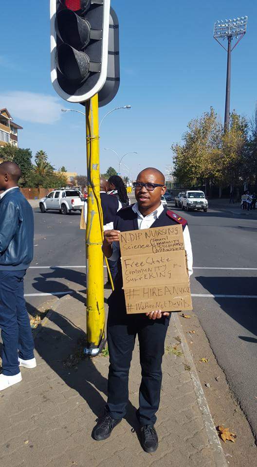 The unemployed nurses are at the Waterfront and PACOFS traffic intersections in Bloemfontein, not far from Bophelo House, the provincial Department of Health headquarters.