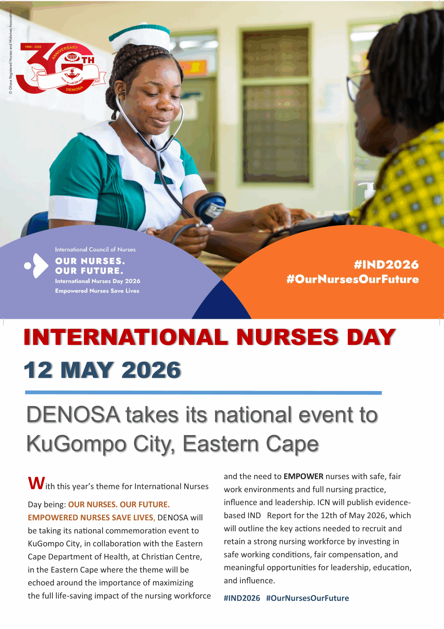 DENOSA, in close collaboration with the Eastern Cape Department of Health, will be co-hosting the International Nurses Day event on 12 May 2026 at the Christian Centre in KuGompo. This year’s IND is held under the theme: OUR NURSES. OUR FUTURE. EMPOWERED NURSES SAVE LIVES. The theme focuses on the essence of investing in the nursing … Read more